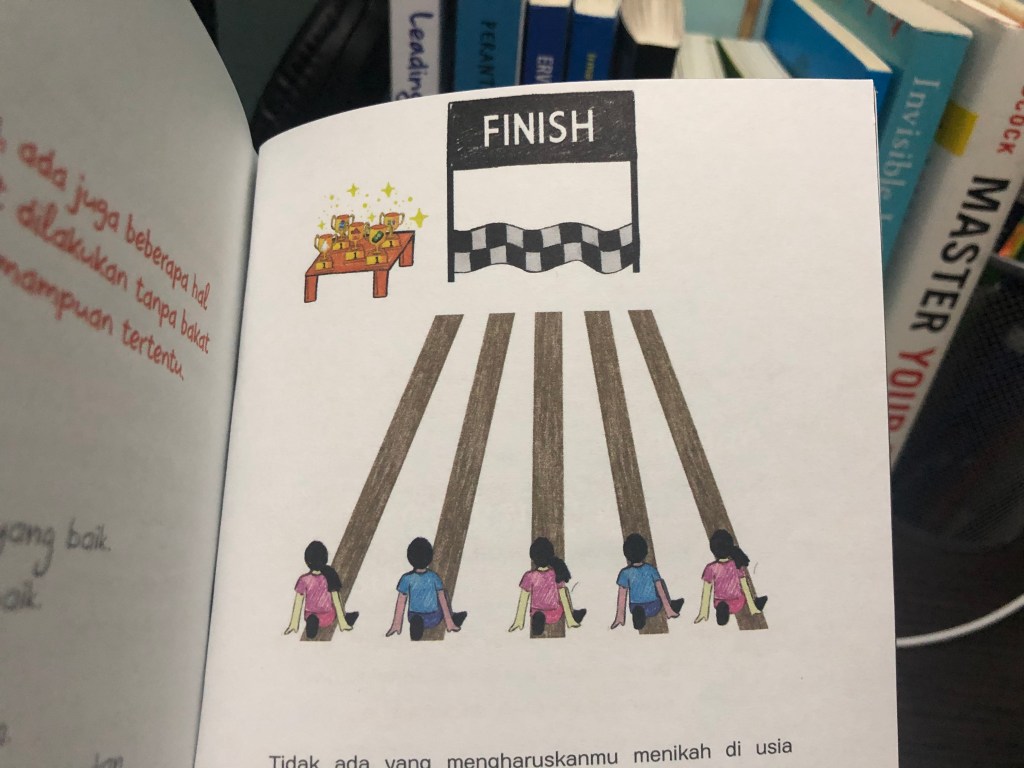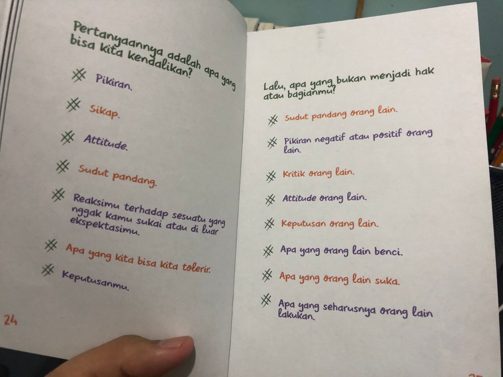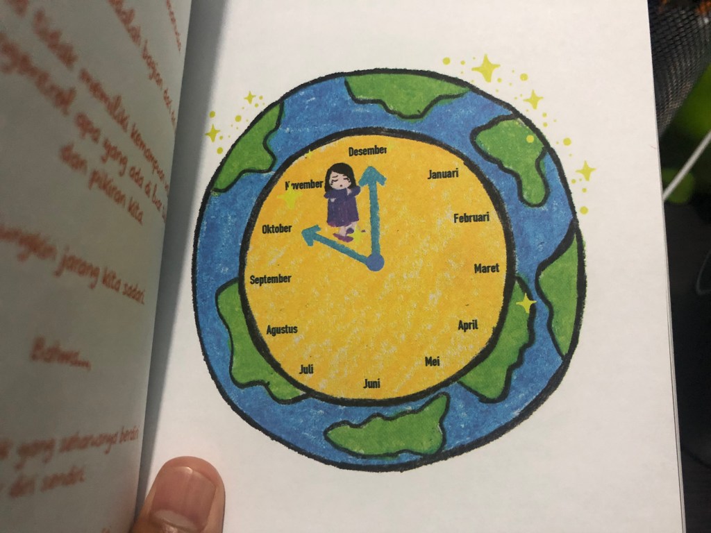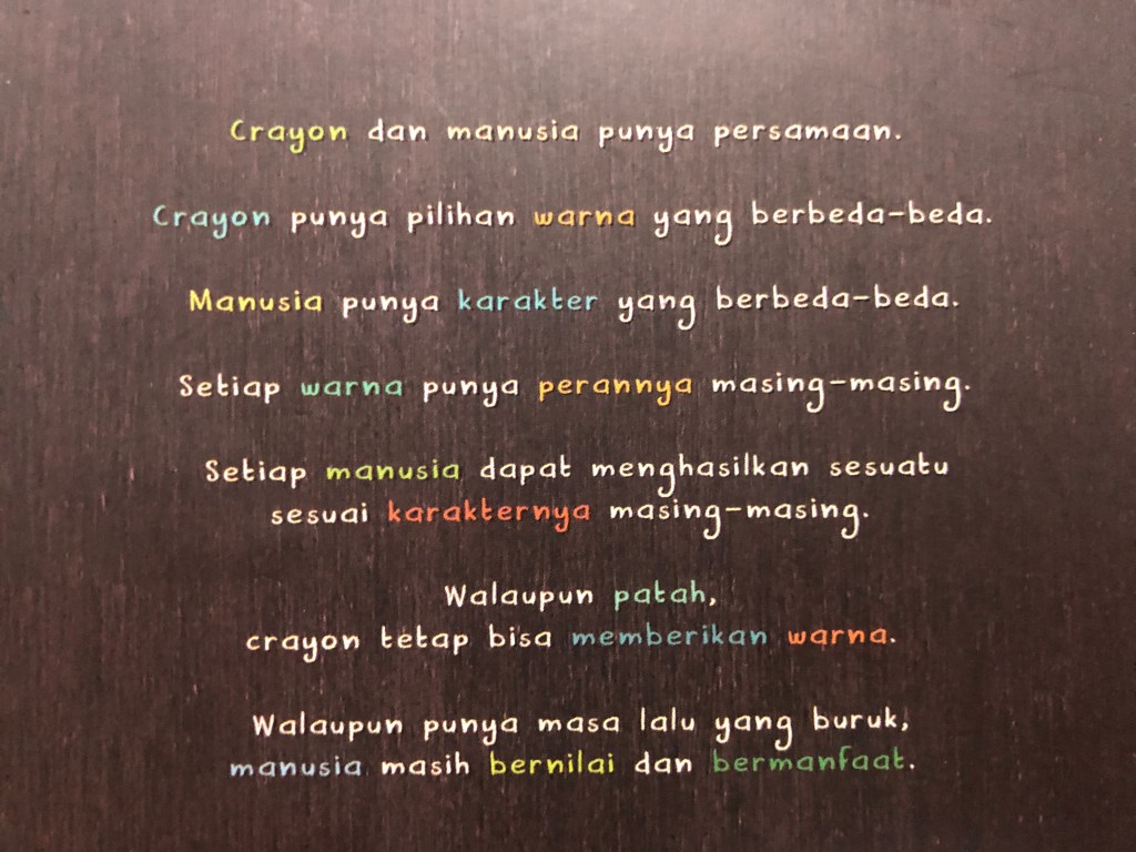 Di salah satu halaman, Carrin Fu menulis “……kamu ini krayon warna apa?”. Lalu terbesitlah dibenakku, apakah aku bakalan bisa tau krayon warna apa yang paling cocok dengan personaliti dan karakterku? Apakah nanti akan ada penjelasan dari setiap warna krayonnya? Untuk tau jawabannya, teman-teman bisa baca terus sampai akhir artikel kali ini ya, hehehe 😊
