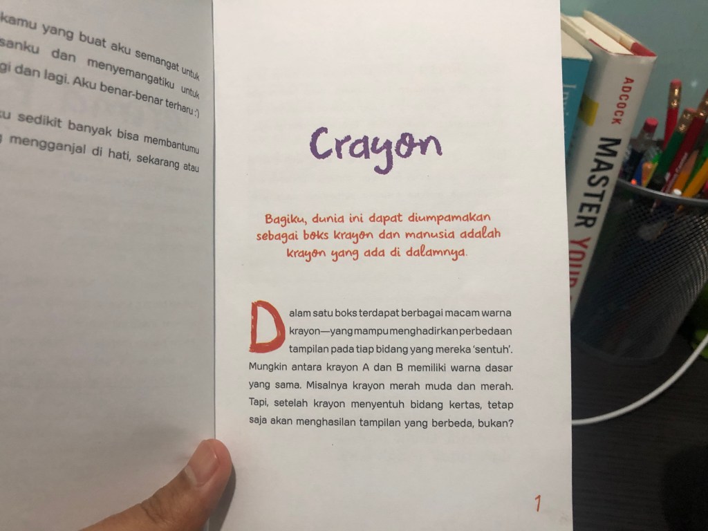 Seperti yang teman-teman bisa lihat pada gambar di atas, sepanjang buku ini teman-teman semuanya bakal disuguhkan dengan tulisan-tulisan yang kaya akan warna dan ilustrasi layaknya krayon. Seluruh isi buku ini diibaratkan dengan krayon sebagaimana judulnya sehingga membuat buku ini cukup menarik untuk dibaca. Diawal sebelum aku beli buku ini, aku berpikir bahwa bukunya akan membahas tentang kehidupan manusia yang unik dan beragam pada lingkungan masyarakat, berbeda warna tapi indah seperti krayon. Tapi……..