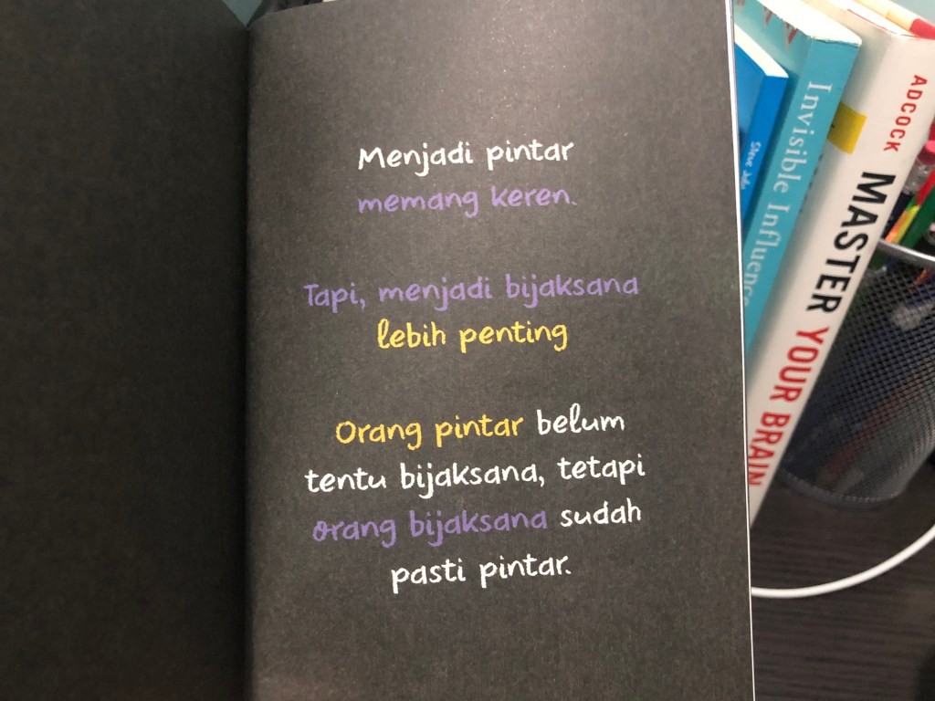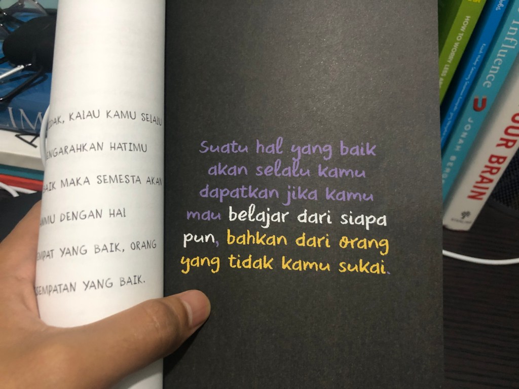 Sebagian besar dari apa yang tertulis pada halaman-halaman berlatar belakang hitam itu cukup bikin aku kaya ‘waaaah, bener banget ini sih’ gitu loh. Di sisi lain, aku juga kaya jadi bisa mengintropeksi diri aku apakah aku udah jadi orang yang baik atau belum buat orang lain. Pokoknya dengan baca buku ini, aku bisa lebih semangat lagi untuk terus memperbaiki diri aku ke depannya. Yuk kita sama-sama jadi orang baik ☺️☺️☺️