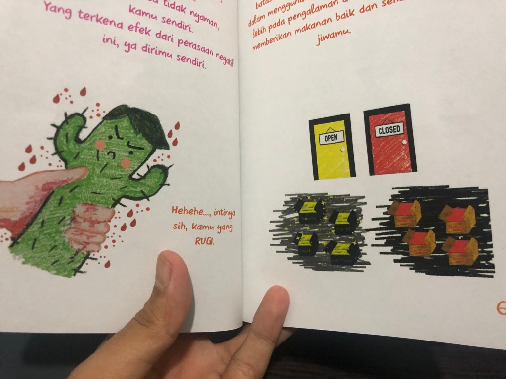 Selain tulisannya yang unik, buku ini juga memiliki cukup banyak ilustrasi yang digambar menyerupai krayon yang bikin mata aku adem liatnya. Aku secara personal memang suka menggambar, jadi liat gambar-gambar seperti ini bikin refresh otak aja gitu rasanya. Selain itu, buat teman-teman yang punya kesulitan untuk baca buku, bisa banget nih coba baca buku ini karena dari gambar-gambar tersebut juga mempresentasikan apa yang sedang dibicarakan di halaman tersebut. Oh iya, ini aku buat ulasan sekadar mau sharing aja siapa tau bisa bermanfaat, bukan karena aku mau marketing bukunya sama kalian lho, hahaha 🤪