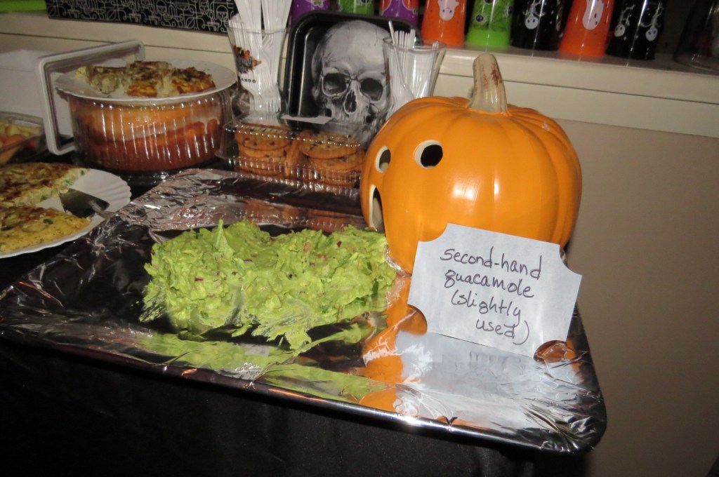 Seperti biasanya, kami pasti membawa makanan kecil dari rumah masing-masing sebagaimana orang Amerika terbiasa melakukannya. Makanan yang dibawa dari setiap orang akan dikumpulkan di satu meja agar bisa dimakan bersama-sama dengan yang lain selama perayaan. Eric ini merupakan seorang vegetarian sehingga biasanya orang-orang yang datang akan membawakan hidangan sehat tanpa daging dan produk hewani. Kami juga menyiapkan pernak-pernik Halloween dari rumah seperti patung Halloween yang terbuat dari labu.